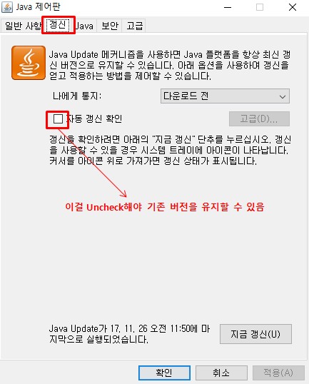 | 제어판 실행 | Java 자동 갱신 Uncheck |